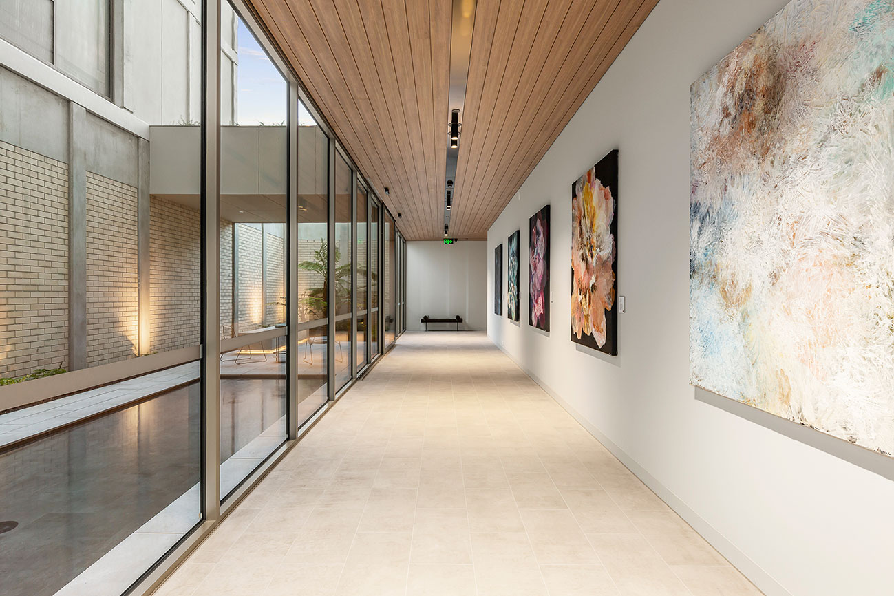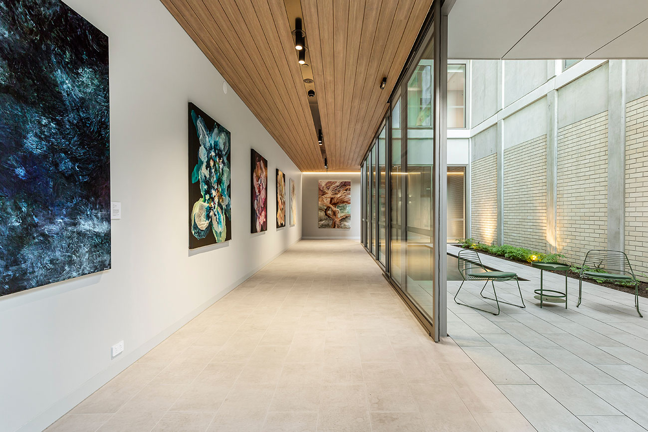 Natural light pours through expansive glass, visually linking the spine of colourful paintings to the courtyard beyond and creating a seamless dialogue between built form and artistic expression.