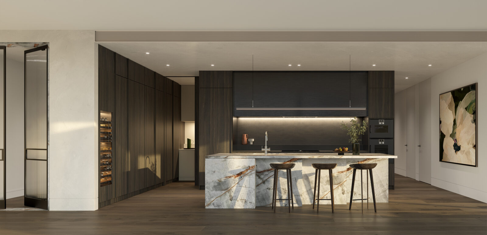 Upon entry, an elegant foyer where honed marble and natural stone create a sophisticated, refined atmosphere.