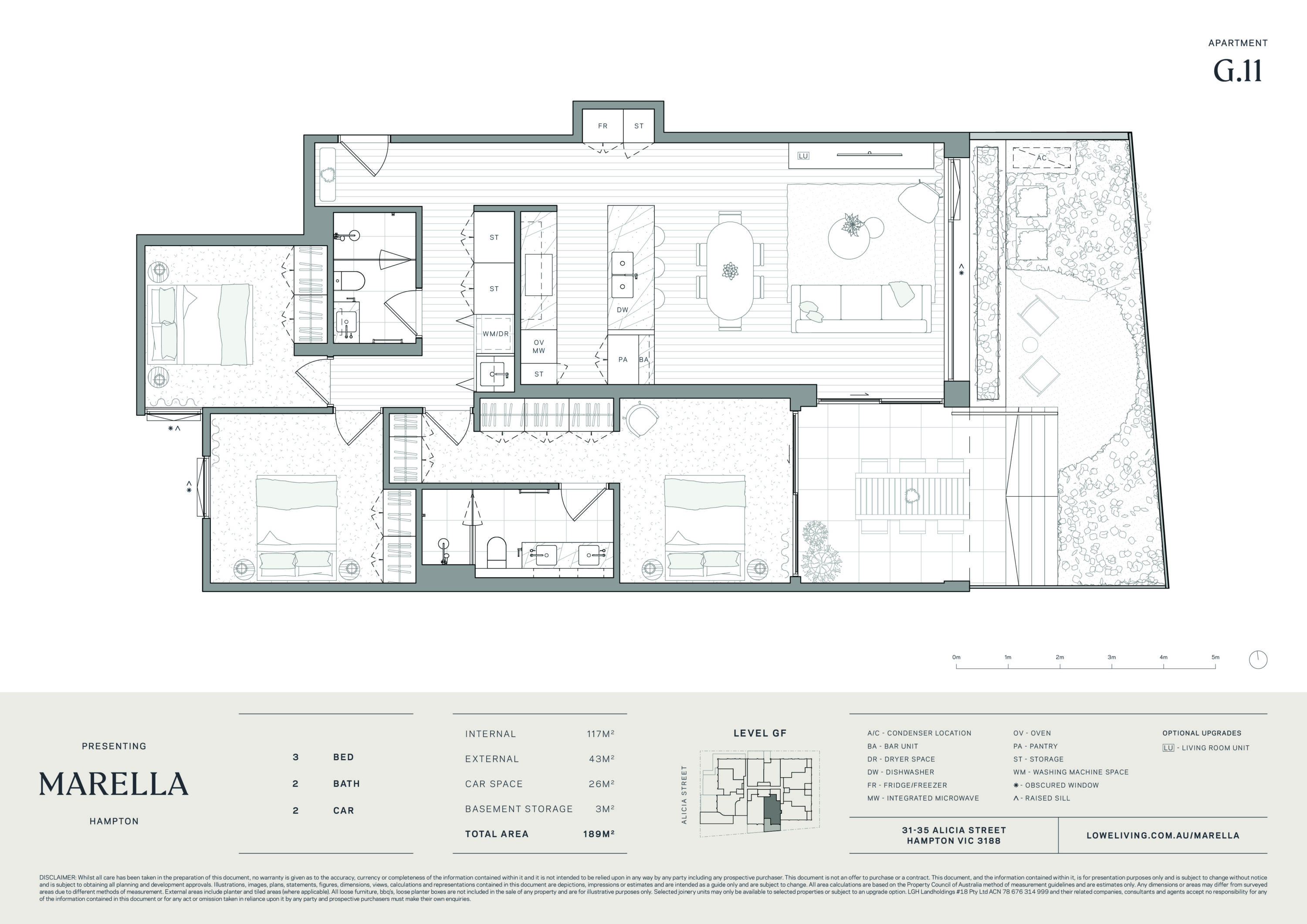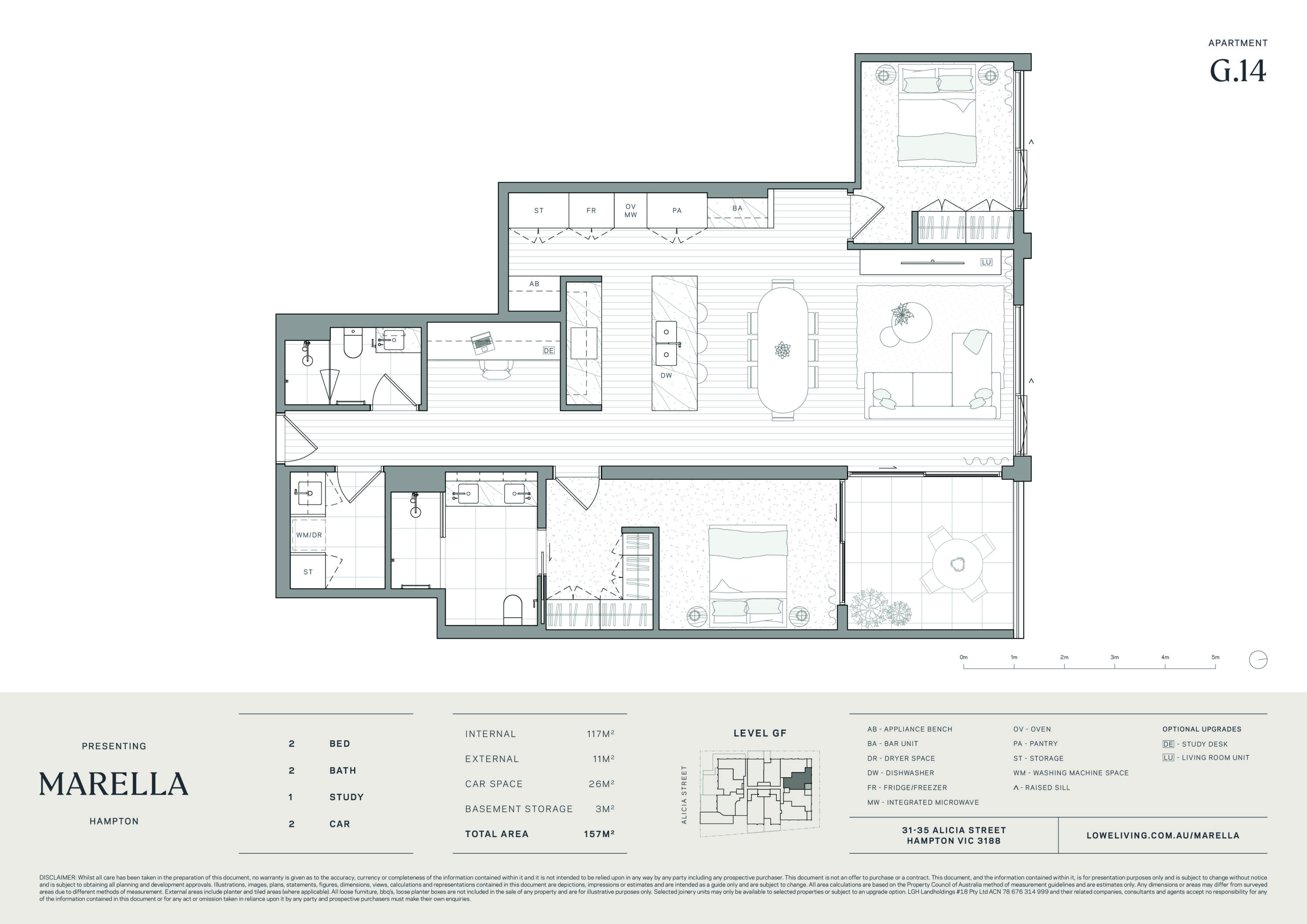 Illustrations, images, plans, statements, figures, dimensions, views, calculations and representations contained are depictions, impressions or estimates and are intended as a guide only and are subject to change. External areas include planter and tiled areas (where applicable). All loose furniture, loose planter boxes, white goods (excluding refrigerators) and other items depicted are not included in the sale of any apartment and are for illustrative purposes only. Living room units are an upgrade option.