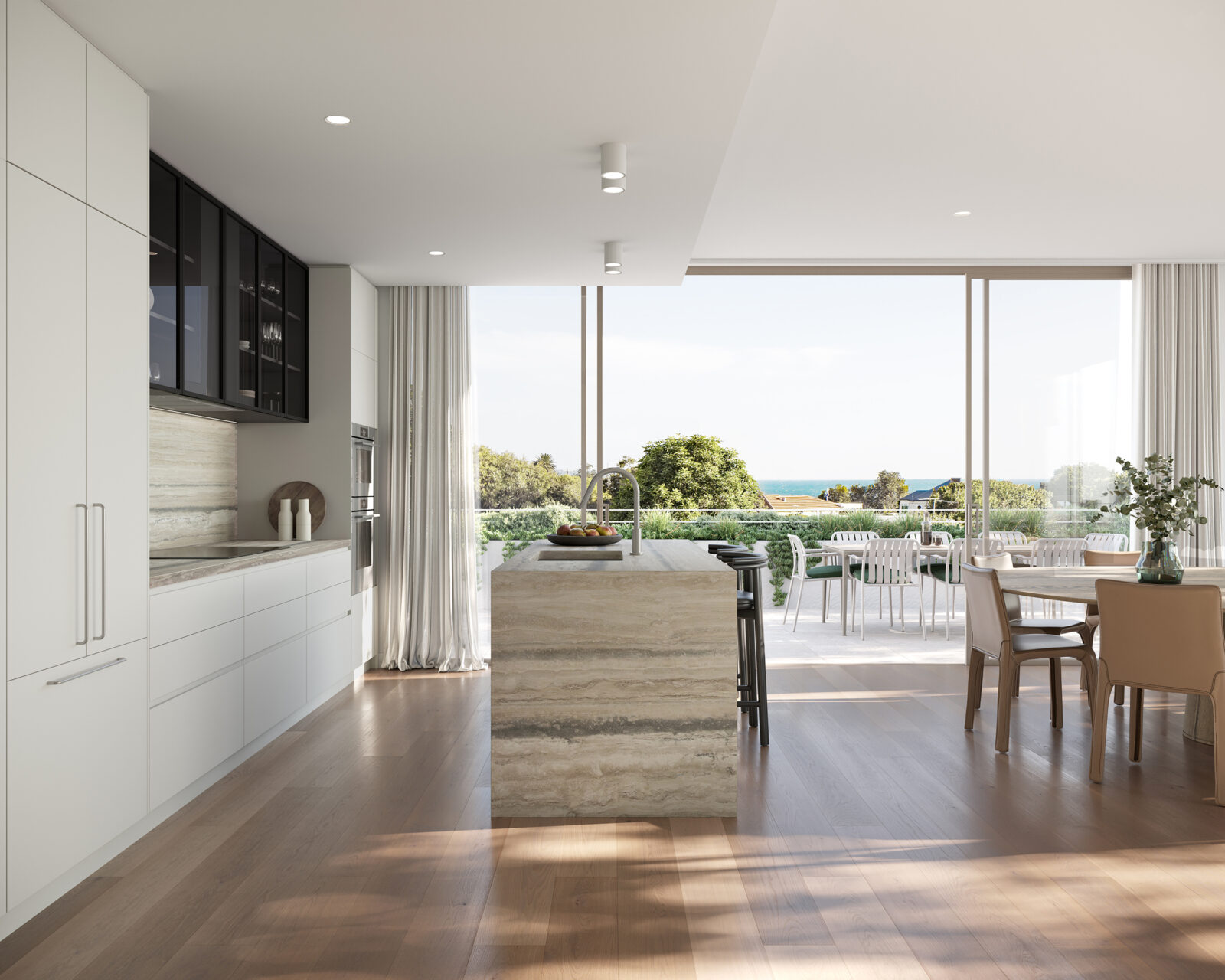 Embracing its coastal exterior is a soft and unassuming tranquil retreat with landscaping by Eckersley Garden Architecture, artfully celebrating Sandringham’s natural landscape. As you pass the lush greenery upon arrival, wander through the light-filled lobby adorned with warm textured travertine look tiles; a narrative of Sandringham’s rich heritage, embracing the serene coastal address.